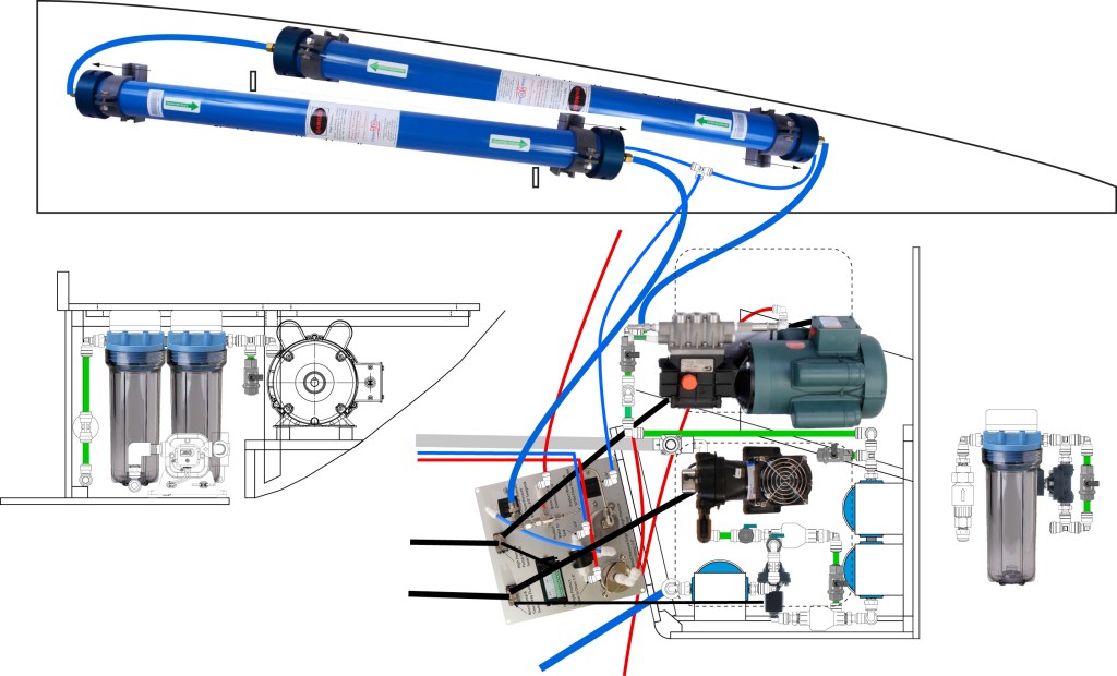 The instruction manual that comes with this watermaker is quite complete. It details how the components go together, the flow of both salt and fresh water, and how to wire the two pumps. Exactly how it all fits together is determined by the location of each component from one another and the obstacles the hoses and tubing have to go around or through.