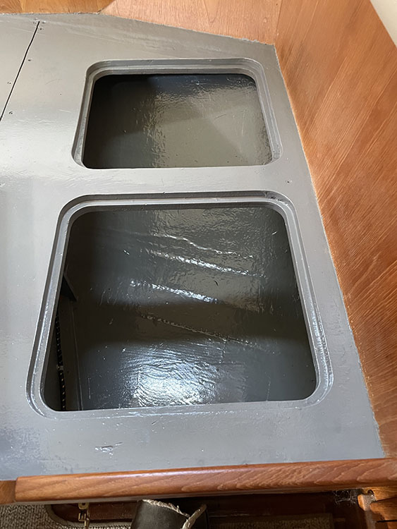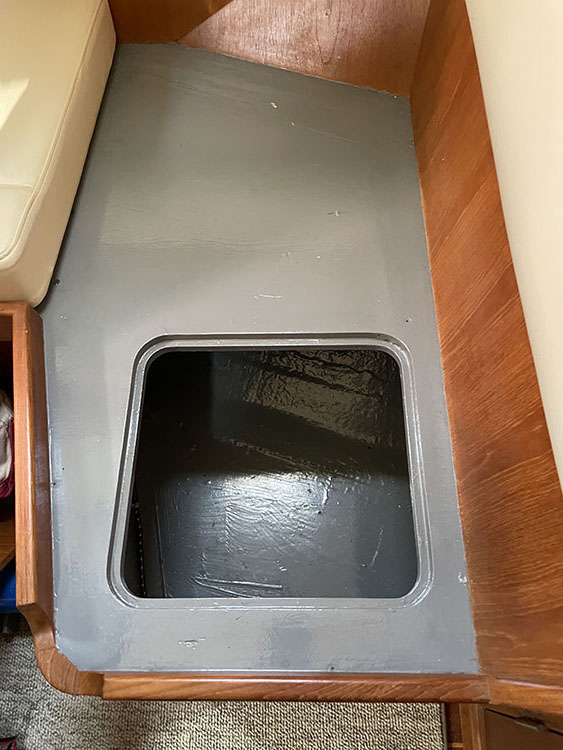 Our boat had one access hatch for the “L” portion of the settee. This didn’t give me enough room to mount the high-pressure pump, so I cut a second hatch over the space where the pump was going. I then built a plywood shelf and epoxied it onto the hull. This took a bit of time, but I felt it was necessary for a proper installation of the heavy high-pressure pump.