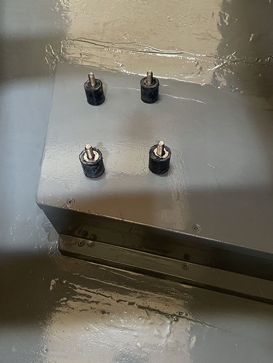 The high-pressure pump motor has a metal base with four bolt holes to attach it to the shelf. It didn’t come with any vibration dampening mounts, so I found some online that would do the job nicely. These mounts would prevent the motor vibration from transferring to the hull, hopefully keeping the noise from the motor down a bit. Before I mounted the motor, I connected the wiring and pressure relief valve tubing as they would have been difficult to connect once the motor was in place.