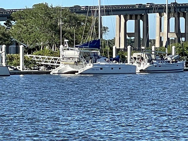 Since the mooring field was very close to the ocean inlet, we had quite a current shift as the tides changed. With the wind blowing in one direction and the current running in the other, the boat was fighting to stay in one place on the mooring ball. Several times the ball was pulled under one hull or the other as the boat shifted to the wind and current. After one night of this, and it was constant, we decided to get a slip at the dock for the remainder of our stay.