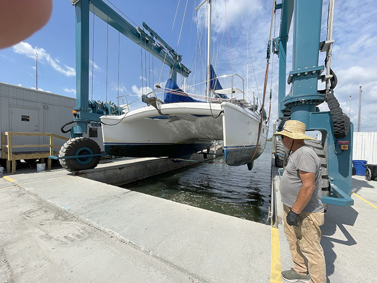 During our stay in Titusville, we made plans to haul out and have some saildrive work done. Our port saildrive had a loose zinc anode that I had noticed while diving and cleaning the bottom in the Bahamas. I was unable to tighten it then, so figured the only way was to haul the boat out and address it on the hard. We made arrangements at Sea Love Boat Works at Ponce Inlet, FL, to haul out on May 28th, so left Titusville in the morning of May 27th. The passage was 35nm and took us most of the day, arriving around 4:45 pm. The next day at slack tide Cerca Trova was in the sling and on its way out of the water.