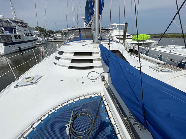 We rented a small AirBnB condo in South Daytona Beach for 9 days while Cerca Trova was in the yard. It was on a bus route that had a stop very close to the boatyard, so I took the bus to and from the boatyard every day to work on the boat. As I was dismantling the zinc anode on the port saildrive, I found that the mounting holes had corroded to the point where they would no longer hold the zinc in place, so I had to order a replacement end cap and wait for it to arrive. In the meantime, I had the yard sand off the copper-based bottom paint from both saildrives and apply a non-copper-based bottom paint. I removed the propellers, sanded them, and applied a prop antifouling paint. Then I tacked polishing and waxing the underside of the bridgedeck and waterline along the hulls. That was a big job, holding the buffer over my head for multiple days. I certainly had a great workout, and probably overdid it.