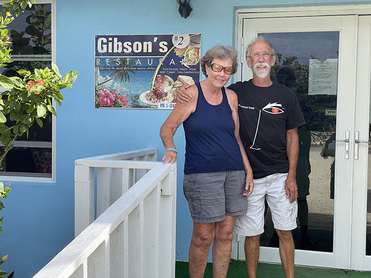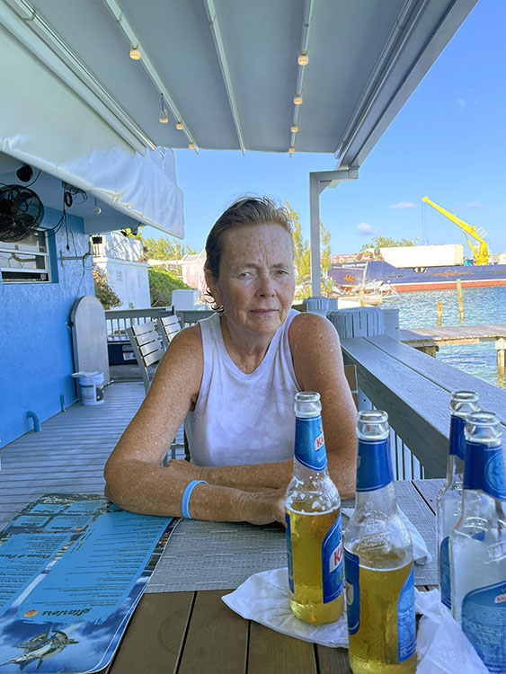 It was calm the next morning so we took the dinghy off the boat. The plan was for me to go get diesel and propane, come back to the boat, and then both of us to go in for groceries and lunch. For some unremembered reason, this didn’t happen that day and we waited until the following day to take the dinghy to town. The wind had picked up a bit so my ride in to get fuel was a little bumpy, but the wind was from behind, so it was a dry ride. The ride back to the boat was another story. Not only had the wind increased, but the wind waves were also bad. It was a very rough and wet ride. There was no way Lynette was going to endure a ride in the dinghy, so I called a water taxi to take us in and bring us back. That was a very wise decision. Yes, it cost $30, but the ride was dry and much more comfortable than the dinghy. We walked down the street from the grocery store and had a good lunch at Island Boy Café. The grocery store wasn’t big, but for the Bahamas, it was quite large and well-stocked.