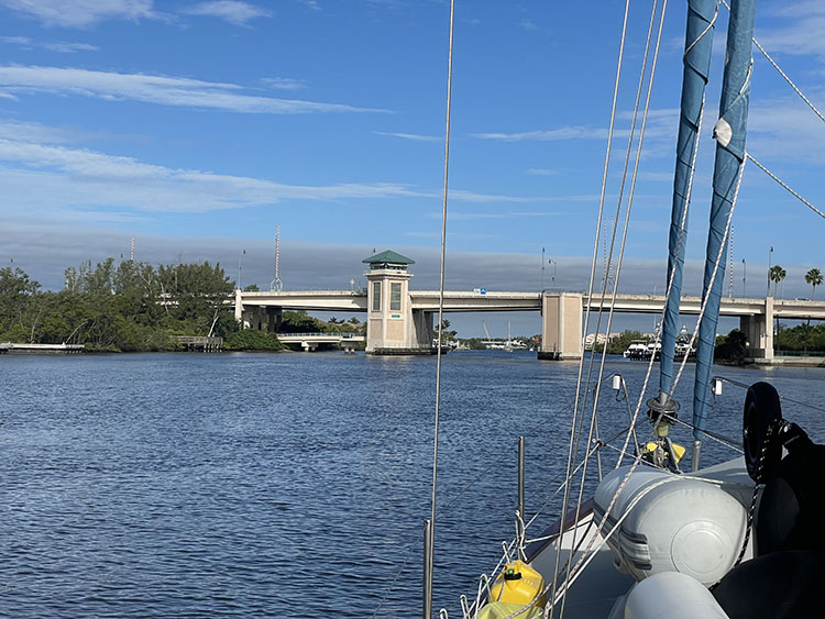 There are two types of bridges on the ICW; fixed bridges that are roughly 65’ high, and drawbridges that require a call on VHF channel 9 for an opening. The drawbridges are bascule bridges that open by pivoting the roadway up from one or both sides. We tested our height under the first fixed bridge by cautiously motoring up to and then under the bridge. From the boat deck, it always looks like you are going to hit the bridge from that viewing angle. We had plenty of room as our air draft is only 59’.