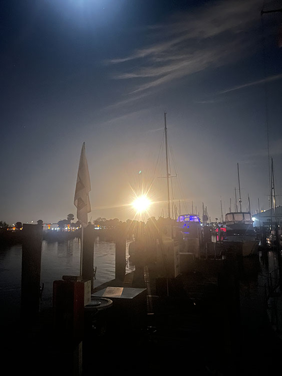 We found out from some marina tenants that SpaceX was going to launch a rocket from Cape Canaveral one night, so we stayed up until 11 pm to watch the event. Neither of us had seen a live rocket launch before, so we were excited to see the event. I noticed a bright light off in the distance and wondered what it was. Within 30 seconds I realized it was the glow from the rocket engines as the rocket was ascending. We were too far away to see anything but the glow. There wasn’t even any sound, as the wind was blowing toward the rocket from us, blowing the sound away. We watched and then saw the booster come back down. It was exciting even though we were quite far away. We found a website that provides information and live coverage of all rocket launches at Cape Canaveral, so found several more launch dates, and watched those launches as well. One was a heavy rocket with two boosters. We could hear the roar of the rockets during that launch, but only faintly due to the distance.